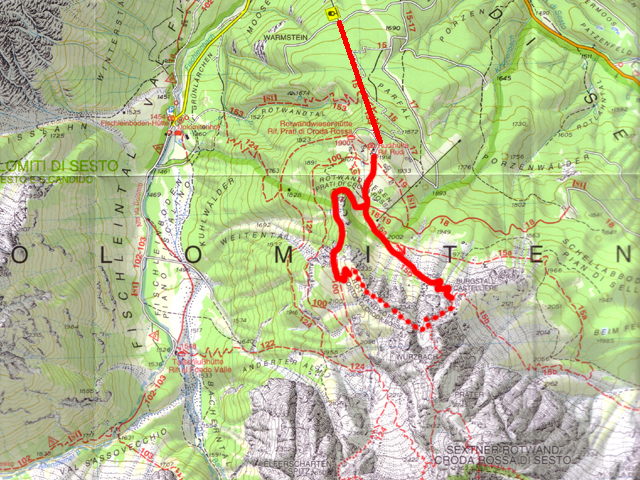 Der geplante Weg: Über den Burgstall (2.121 m) einsteigen in den Klettersteig über die Rotwandköpfe (2.477 m) und dem Grat folgend wieder zurück zu den Rotwandwiesen (1.915 m).