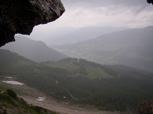 Wenn es mal ein wenig aufreißt, hat man aus unserer Höhle einen schönen Blick über die Rotwandwiesen nach Sexten hinunter.